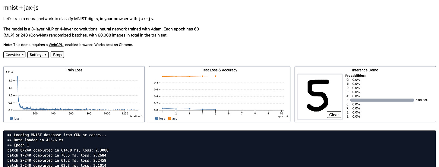 Here is a runnable example of training a neural network from scratch on MNIST dataset in your browser. It learns to >99% accuracy in seconds, and everything from dataset loading to matmul kernels is pure frontend JavaScript code.