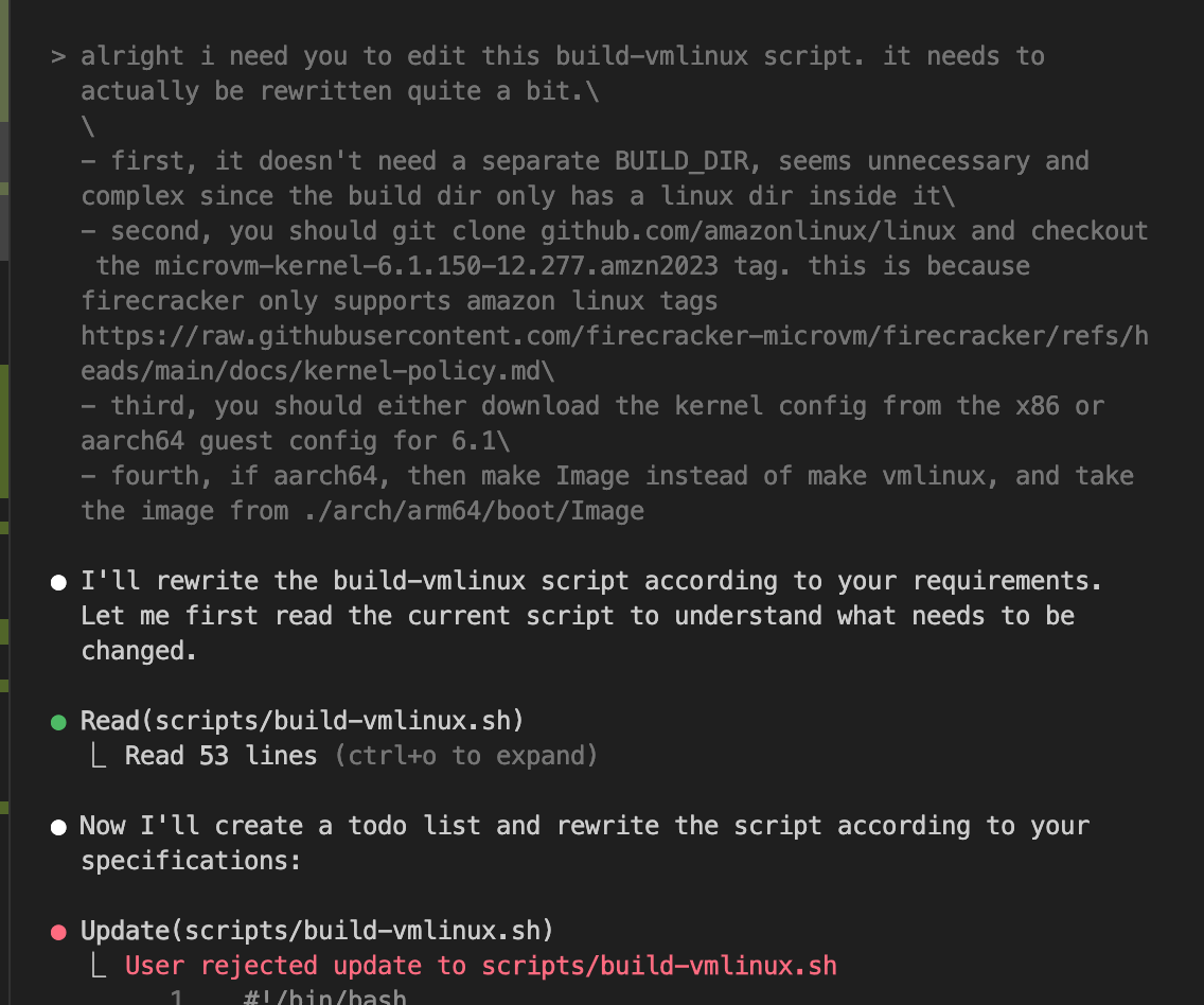 So we initialize the project, and I give the AI some basic direction. To start up the VM, we’ll embed a static firecracker binary + vmlinux inside our own binary during the build process, which can be spooled to a tempfile and execv’d.
