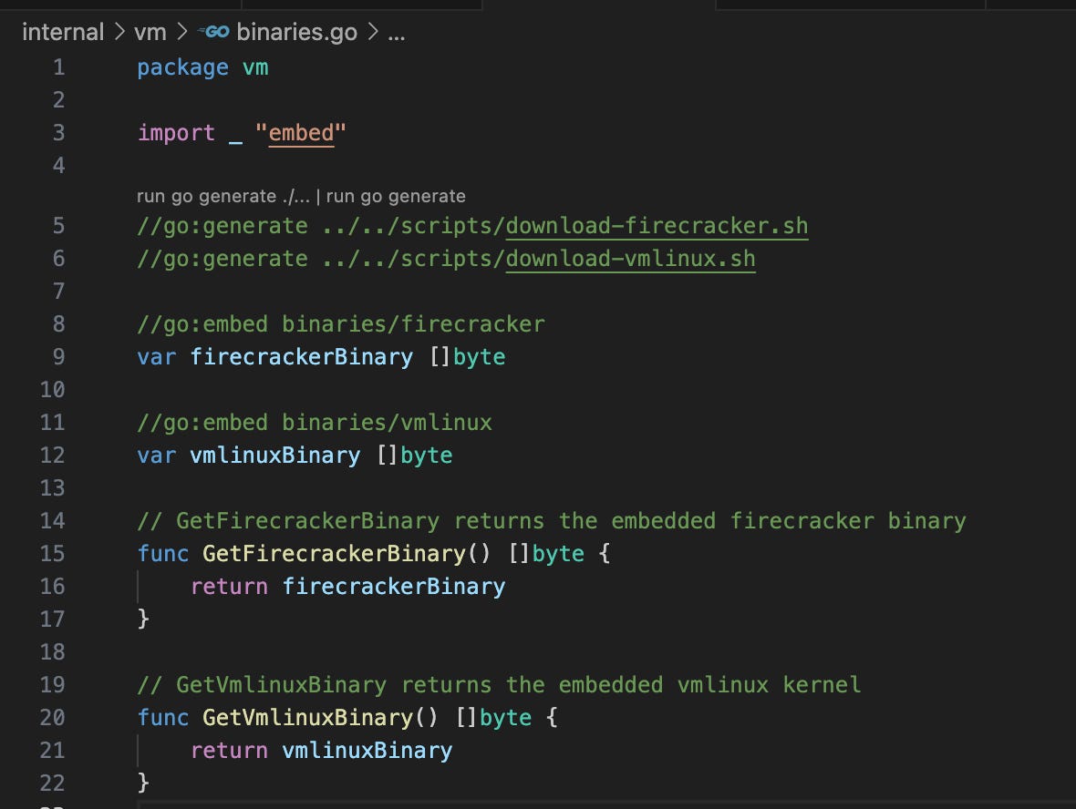 - Provisioning: Extract embedded Firecracker binary, configure VM