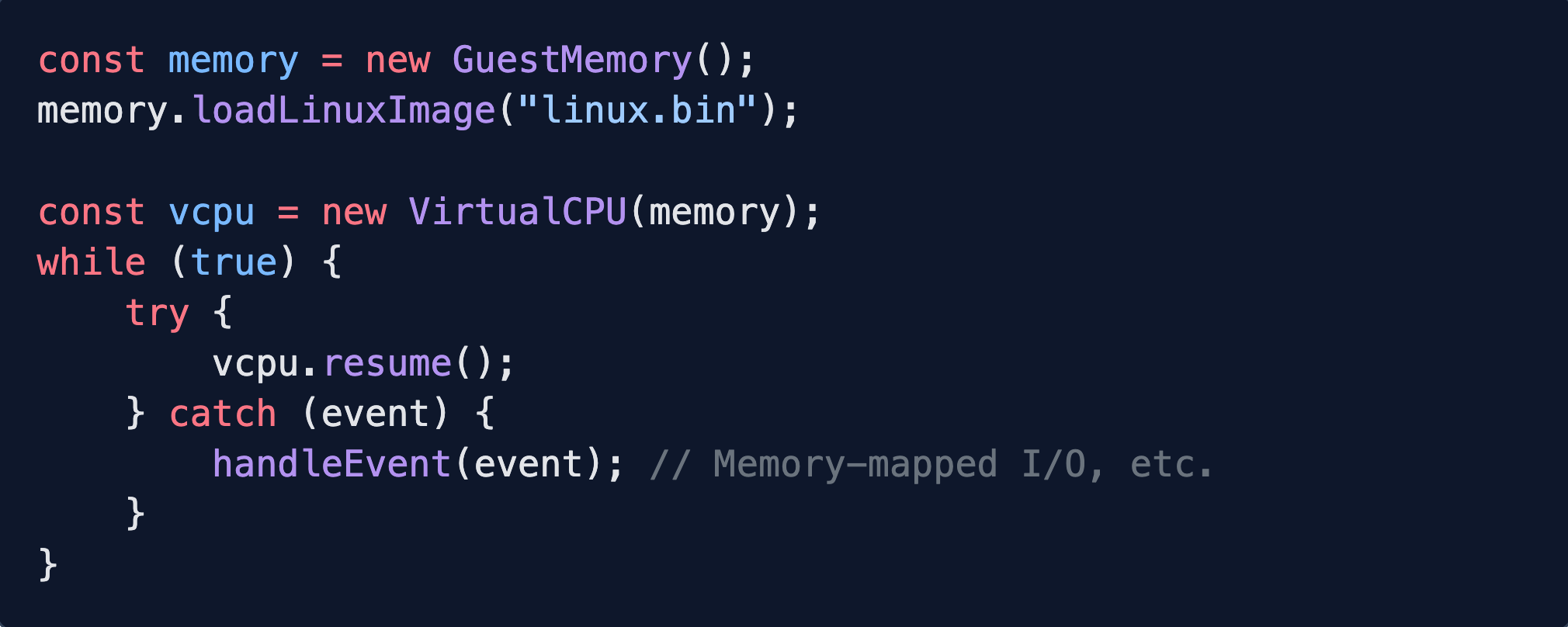 tryblock,catches events (VM exits), and goes back to the guest mode again.