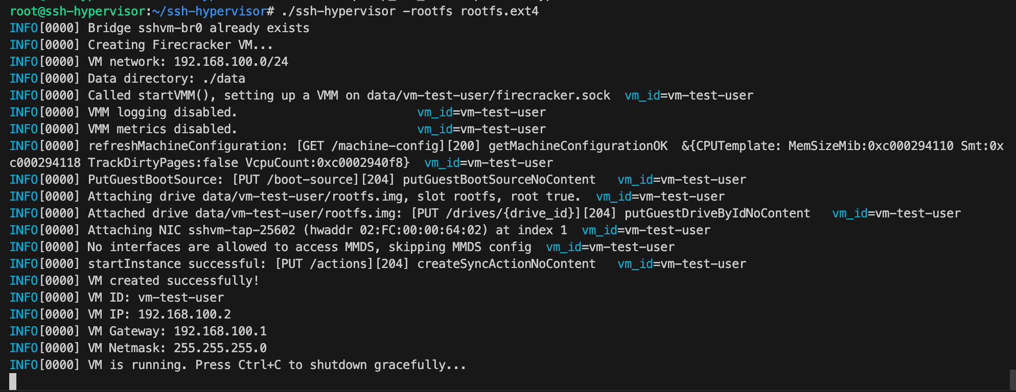 So now it’s working. I can run the binary with a provided rootfs (built from an Alpine image with customization) and it starts a full VM! I can see the serial logs too.